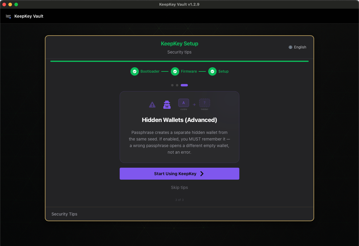 Your recovery phrase generates a “main wallet” by default. With a passphrase enabled, your KeepKey combines the phrase with the passphrase you type and generates a second wallet — a completely different set of addresses, balances, and keys.