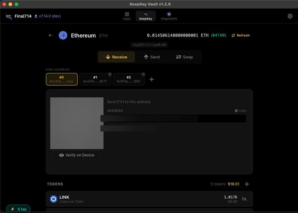 Sending and receiving are two of the most important flows in the desktop application. Both go through your hardware device — you always verify the recipient address or the incoming address on the KeepKey screen itself.