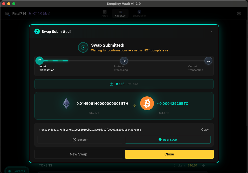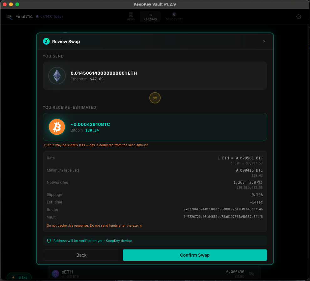 Click Swap, and the device takes over. It shows you the transaction to sign — for cross-chain swaps, this is usually a deposit to a swap contract or a THORChain MsgDeposit.